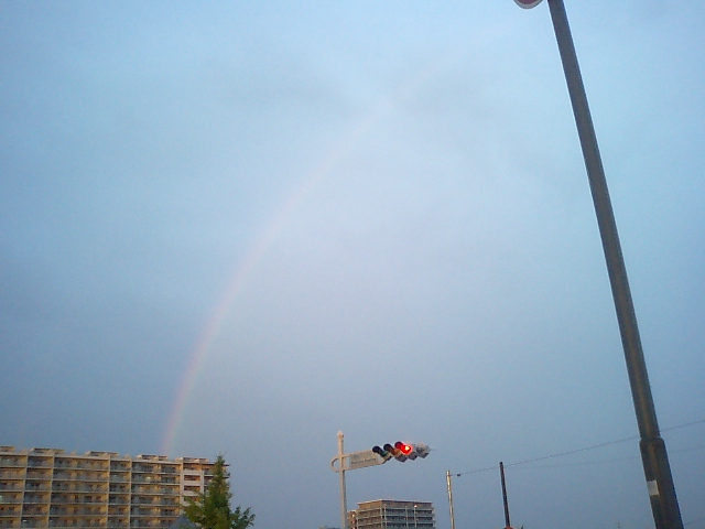 今日は虹が出てた。雨降ってたけど。初めて虹が半円を描いてるのを見た。繋がっていた。綺麗だった。後ろにあった夕日もこんなカメラじゃ写らんほど綺麗だったww