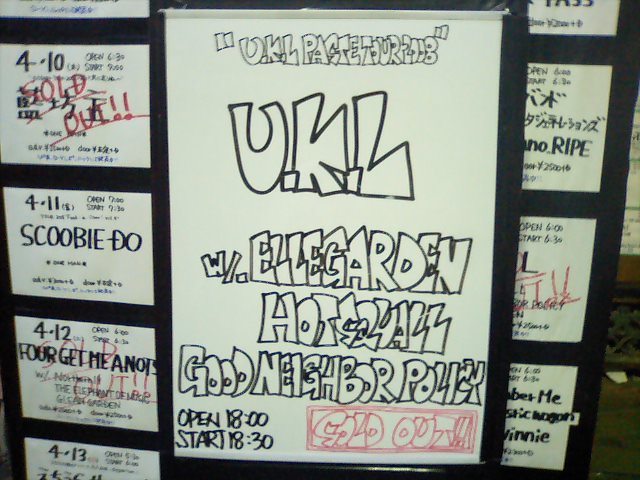 てか、昨日はULKを見に行ったわけですが、ハードコアやっばいね。体中が痛いです。ふぁっく言い過ぎでしょ(笑 はーどこあよりメロコアのが好きだな(ぇ でも念願のエルレ@ちばるっくだったし、ヘドバンとか左回りとか普通に楽しかったからおk。ハードコアのきついところは疲れたとき休むのが困難なことかなー。立ち止まると激突だからね☆笑。てかUKLがアンコールでエルレのFire Crackerのイントロやりだしてでも歌えてなくて演奏止めてCome onTakeshiとか言って武士呼んだしね笑。そして武士来たしね笑。そして武士降ってきたしね笑。
