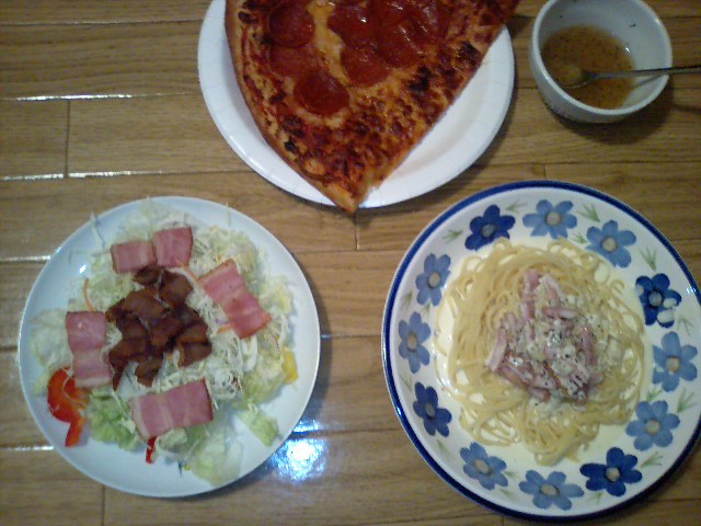 カルボナーラちょう美味しかったよ(はぁと)たくん帰ってベッドが広い。ってか寂しいなぁ……………